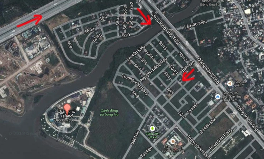 Cầu qua đảo Kim Cương dự kiến sẽ xây trên tuyến đường ven sông Sài Gòn, kết nối từ khu dân cư Thạnh Mỹ Lợi . Ảnh: Google map