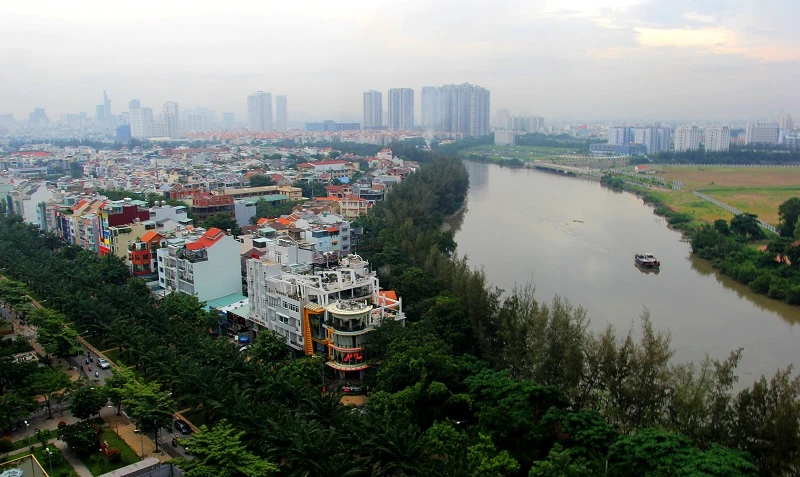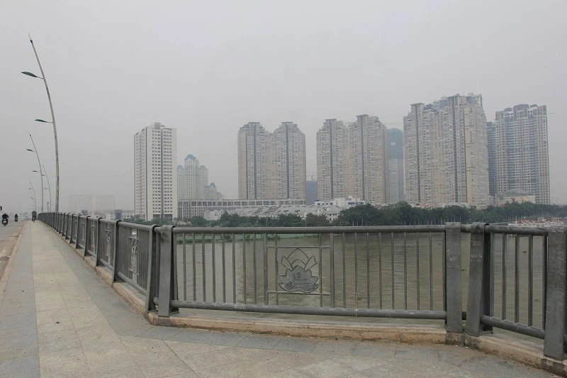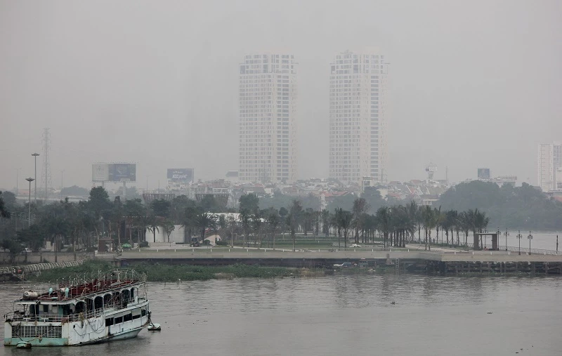 Các tòa nhà dọc sông Sài Gòn vẫn còn chìm trong sương mù.