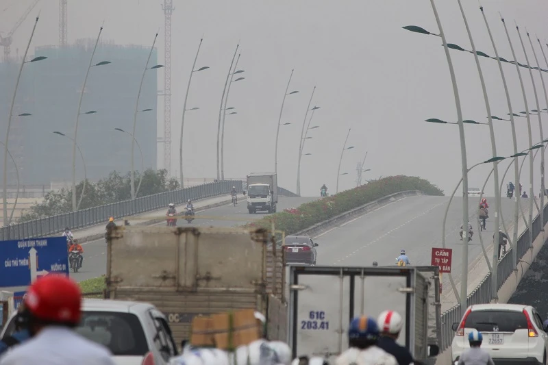 Tầm nhìn người tham gia giao thông bị hạn chế khi xuống cầu Sài Gòn do sương mù.