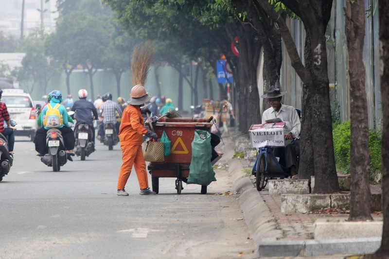 Người lao động trên đường Nguyễn Hữu Cảnh (quận Bình Thạnh) dưới màn sương trắng.