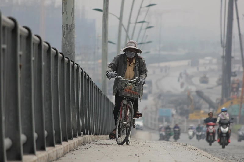Cầu Bình Lợi trong màn sương mù trắng đục.