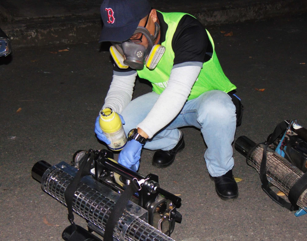 Nhân viên y tế pha thuốc chuẩn bị phun diệt muỗi. Ảnh: TRẦN NGỌC