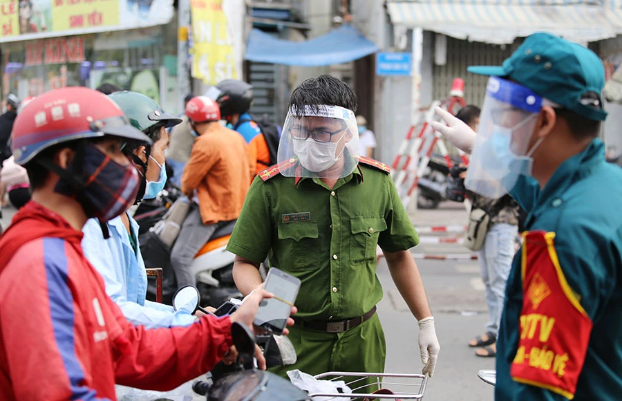 Lực lượng chức năng chốt kiểm soát dịch đường Phan Văn Trị đang kiểm tra người dân khi ra vào quận Gò Vấp ,TP.HCM. Ảnh: HOÀNG GIANG