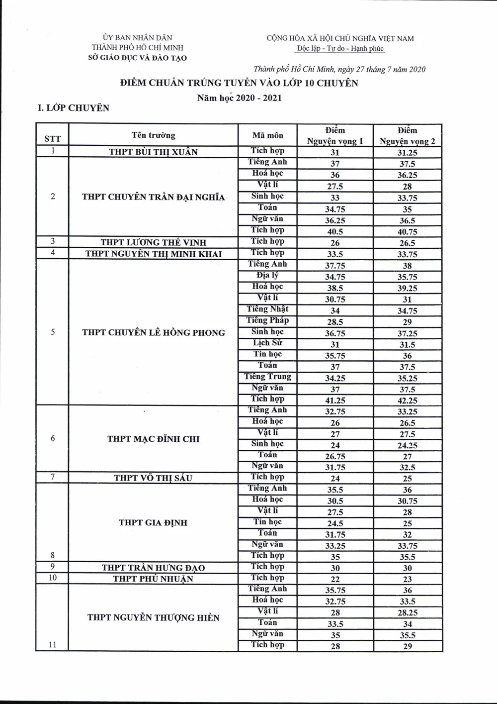 Sáng 28-7, Sở GD&ĐT TP.HCM công bố điểm chuẩn vào lớp 10 chuyên và tích hợp các trường THPT.