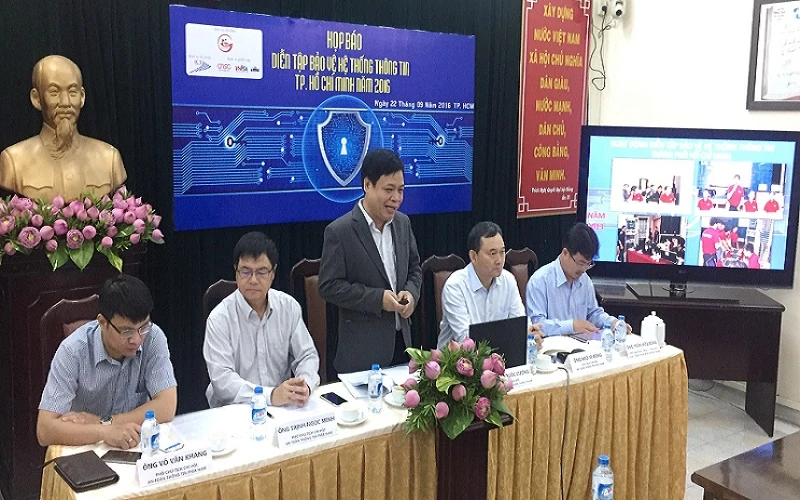 Ngày 22-9, thực hiện chỉ đạo của UBND TP.HCM, Sở Thông tin và Truyền Thông (TT&TT) TP.HCM phối hợp cùng Hiệp hội An toàn thông tin (Chi hội phía Nam), Bộ Quốc phòng và Công ty Phát triển Phần mềm Quang Trung tổ chức họp báo về cuộc diễn tập an ninh mạng 2016 trên địa bàn TP.