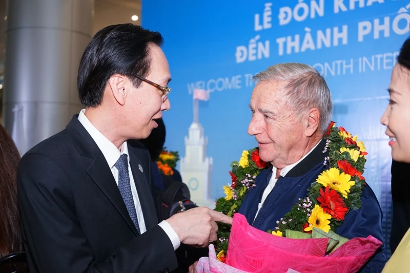 Phó chủ tịch thường trực UBND TP.HCM (trái) thăm hỏi vị khách quốc tế thứ 7 triệu Tissot Jean Claude.