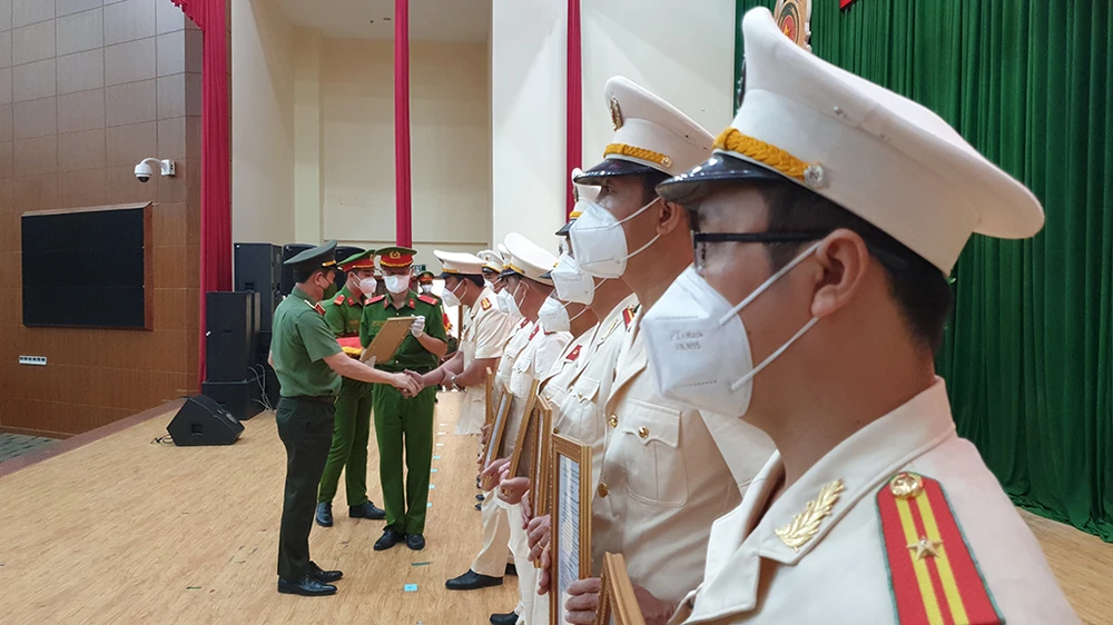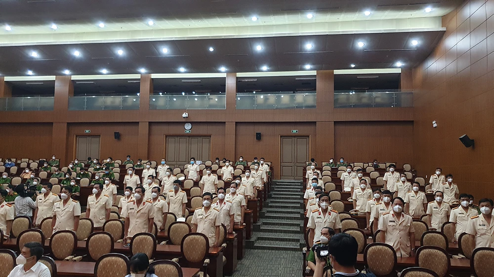 Thiếu tướng Lê Hồng Nam, Giám đốc Công an TP.HCM trao Quyết định bố trí 58 cán bộ công an chính quy làm trưởng công an các xã. Ảnh: NT
