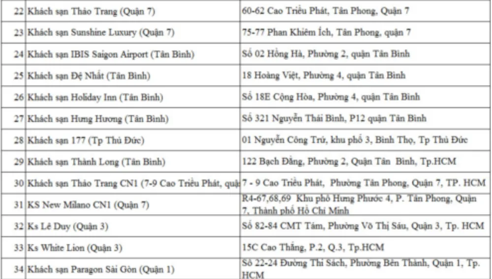 Danh sách khách sạn tiếp nhận cách ly tập trung có thu phí trên địa bàn TP.HCM: