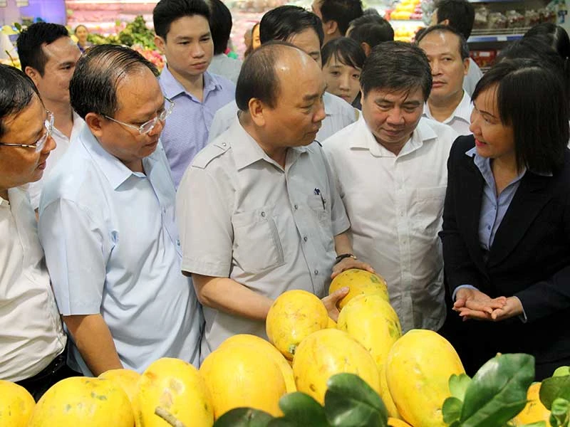 Thủ tướng Nguyễn Xuân Phúc hỏi nhân viên Siêu thị Co.opmart về nguồn gốc các loại thực phẩm bán tại siêu thị. Ảnh: HOÀNG GIANG