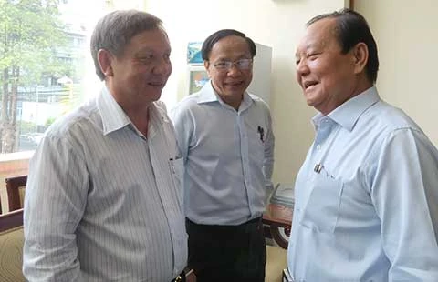 Bí thư Thành ủy TP.HCM Lê Thanh Hải (bìa phải) trao đổi với các đại biểu bên lề hội nghị. Ảnh: TÁ LÂM