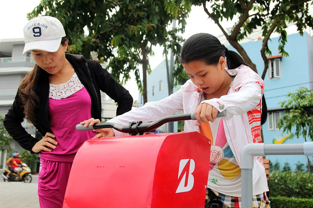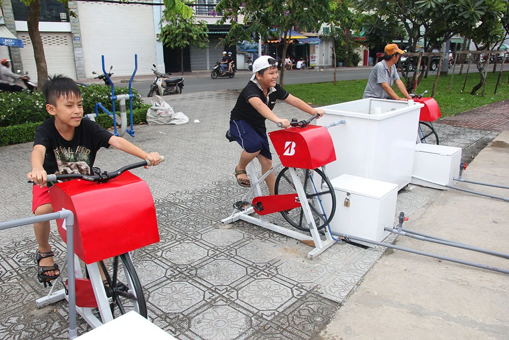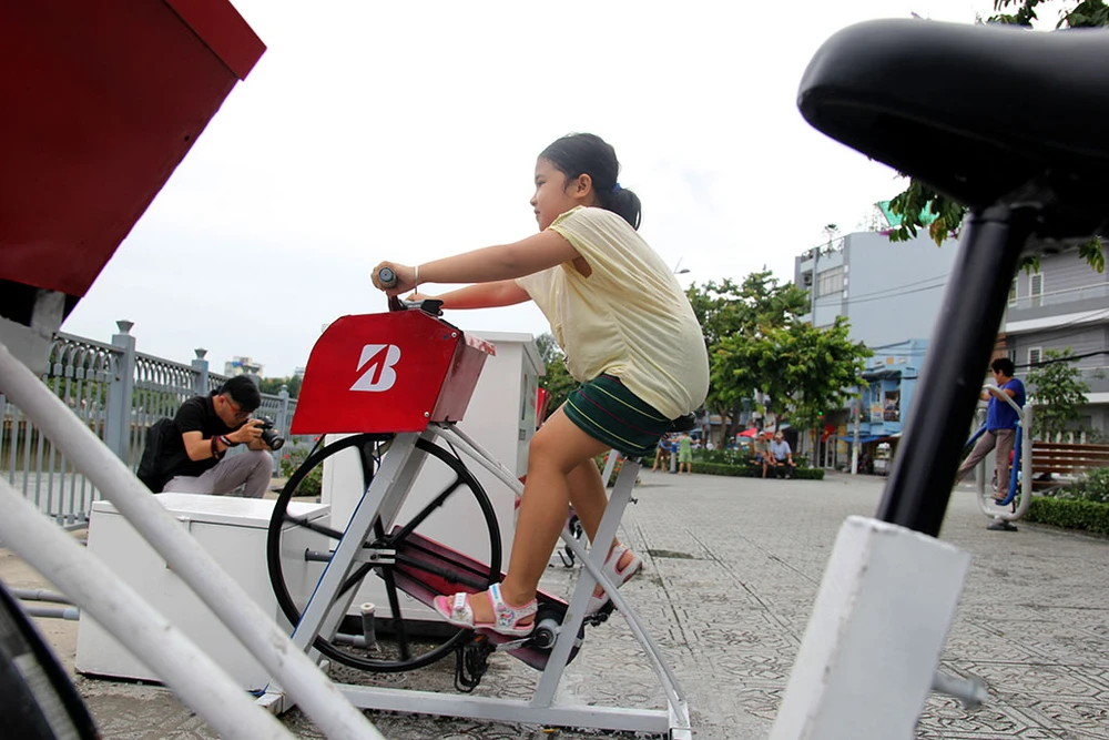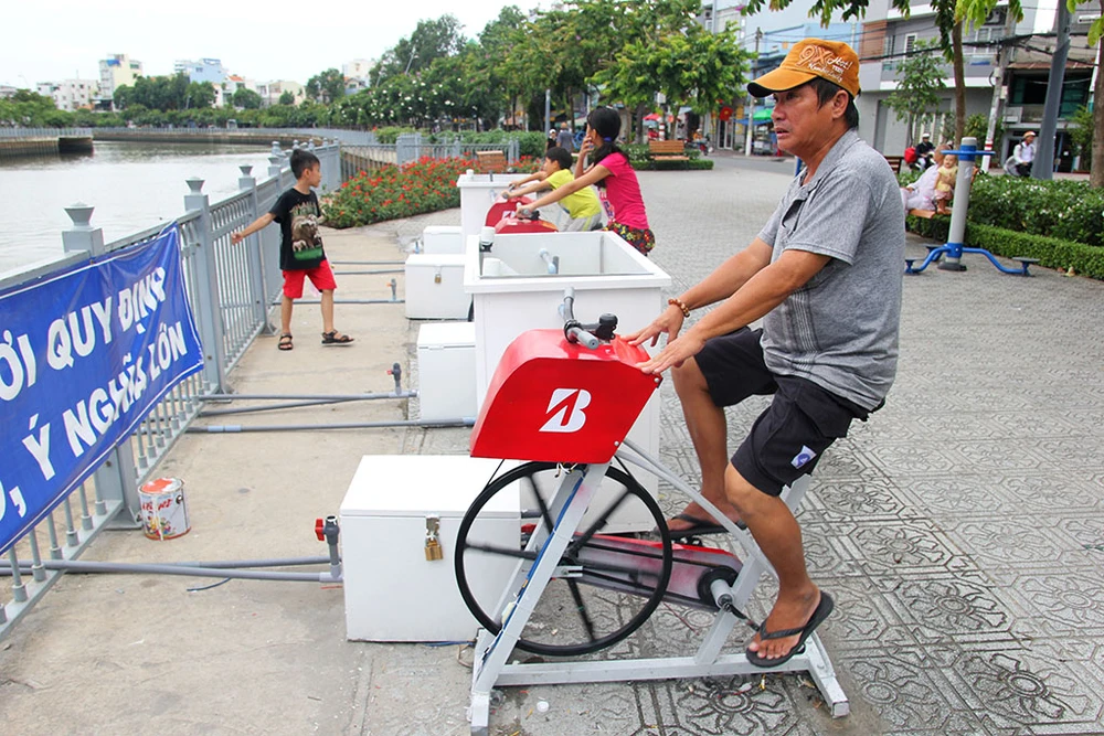 Người dân thích thú đạp thử xe đạp, vừa giúp tập thể dục kết hợp lọc sạch nước dòng kênh Nhiêu Lộc - Thị Nghè.