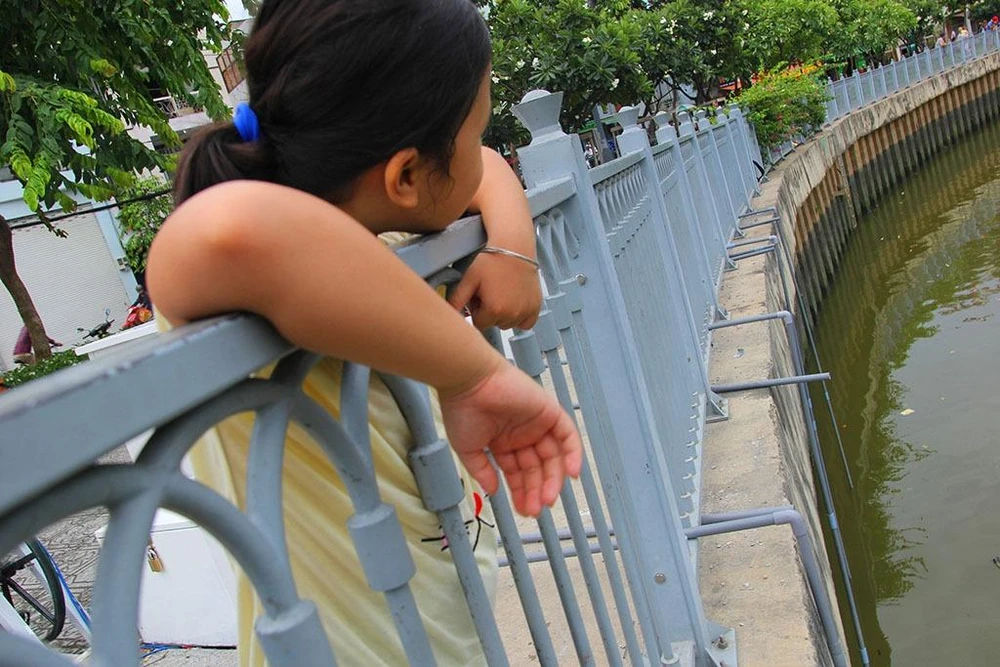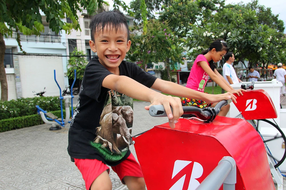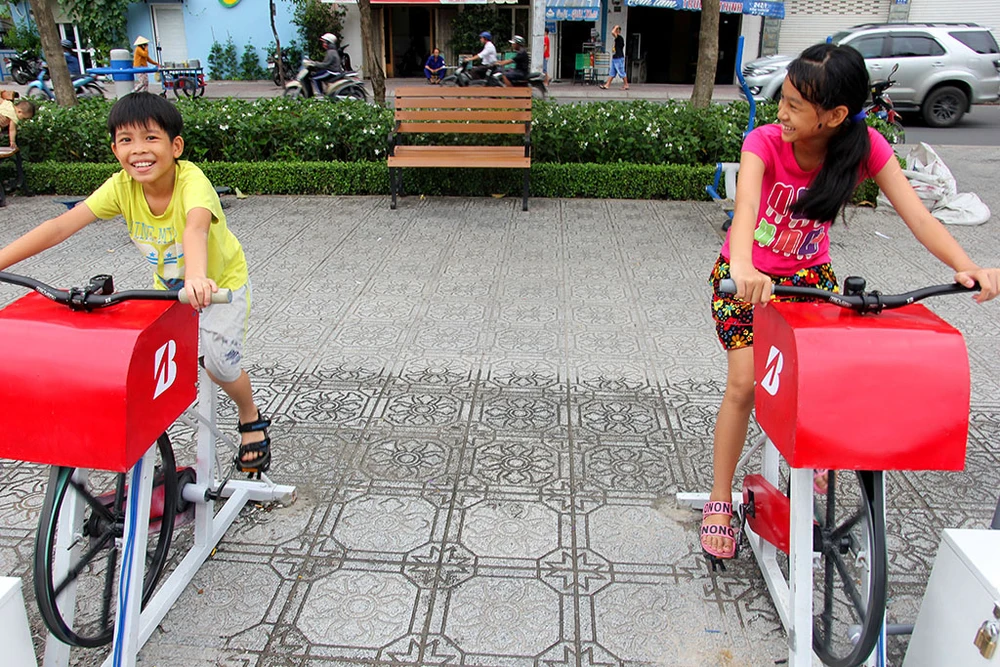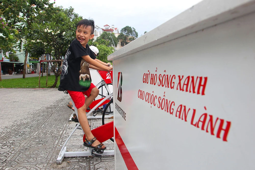 Những đứa trẻ thích thú đạp xe vì nó giúp lọc sạch nước cho dòng kênh.