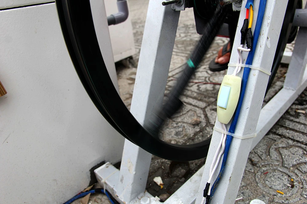 Hai dây curoa kéo bánh xe chuyển động tạo vòng quay cho chiếc motor phát điện gắn dưới đầu xe hoạt động tạo ra dòng điện.