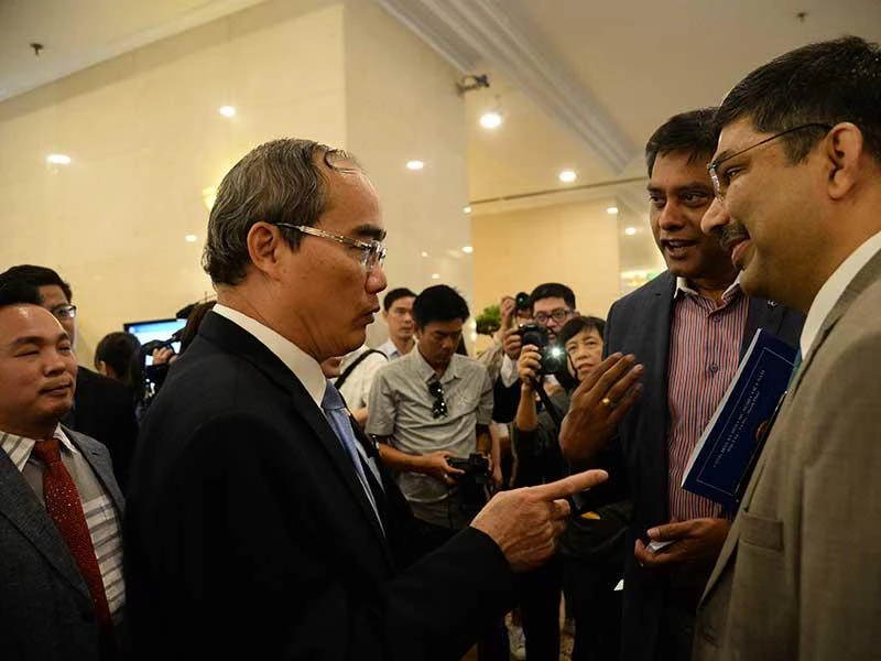 Bí thư Thành ủy TP.HCM Nguyễn Thiện Nhân trao đổi trực tiếp với các nhà đầu tư trong và ngoài nước tại hội nghị. Ảnh: Tá Lâm