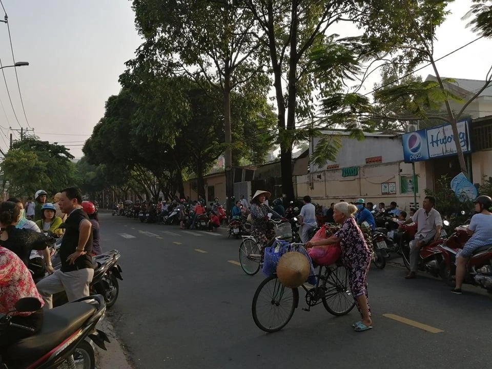 Phụ huynh xếp hàng dài phía bên kia đường ngóng vào trường trước giờ các thí sinh bước vào kỳ thi quan trọng. Ảnh: HẰNG TRẦN.