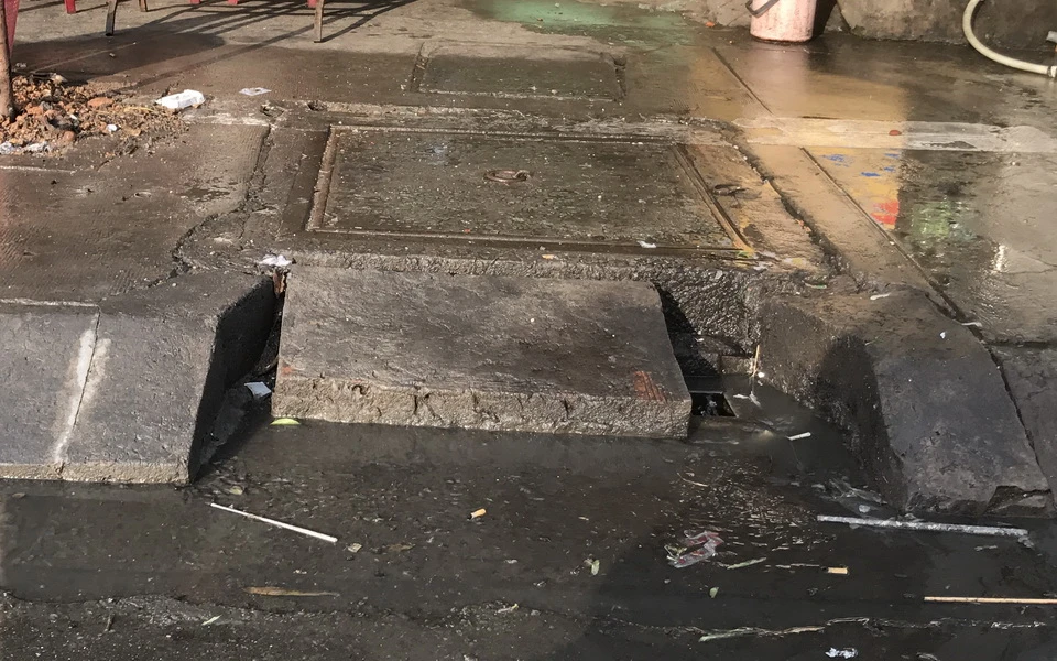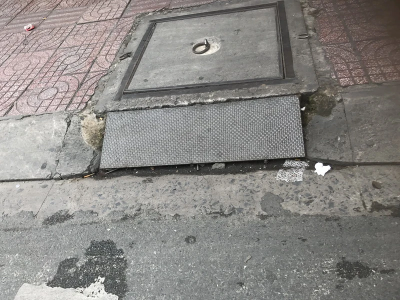 Miệng cống bị chặn lại bằng thanh gỗ trên đường Huỳnh Văn Bánh, quận Phú Nhuận.