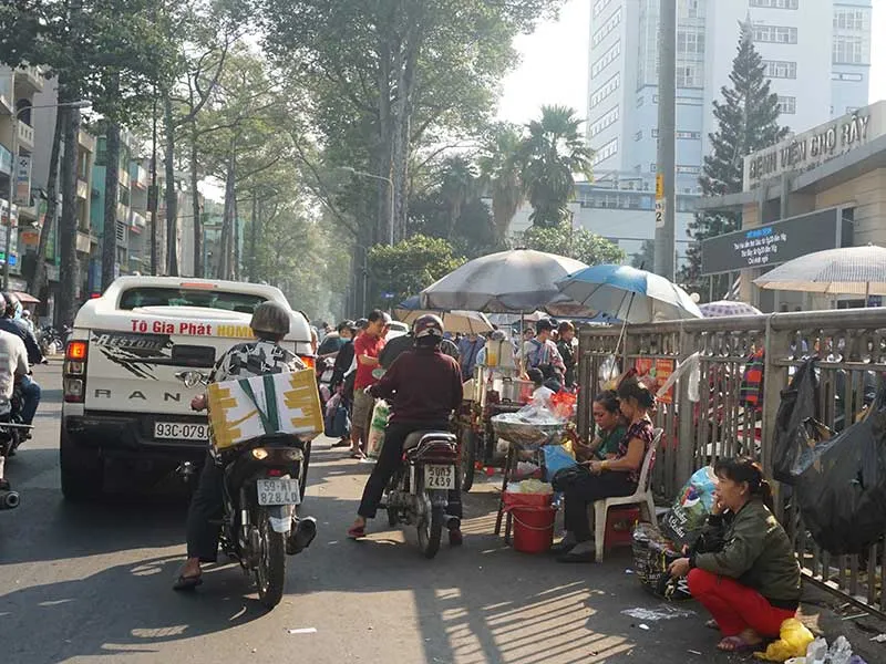 Chị Cao Xuân Huệ (ngụ trên đường Nguyễn Chí Thanh, quận 5) bày tỏ: “Cứ giờ cao điểm buổi sáng và buổi chiều là kẹt cứng. Kẹt xe một phần là do xe đưa đón bệnh nhân ra vào xung đột nhau giữa cổng BV, một phần chính là do những người bán hàng rong bày binh bố trận ở đây”.
