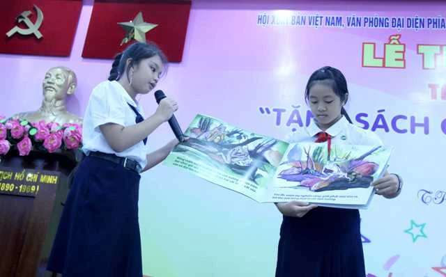 Hai em học sinh đến từ quận 5 kể câu chuyện “Người đi săn và con vượn” trong lễ trao tặng sách sáng 15/8 - Ảnh: Hoàng Giang