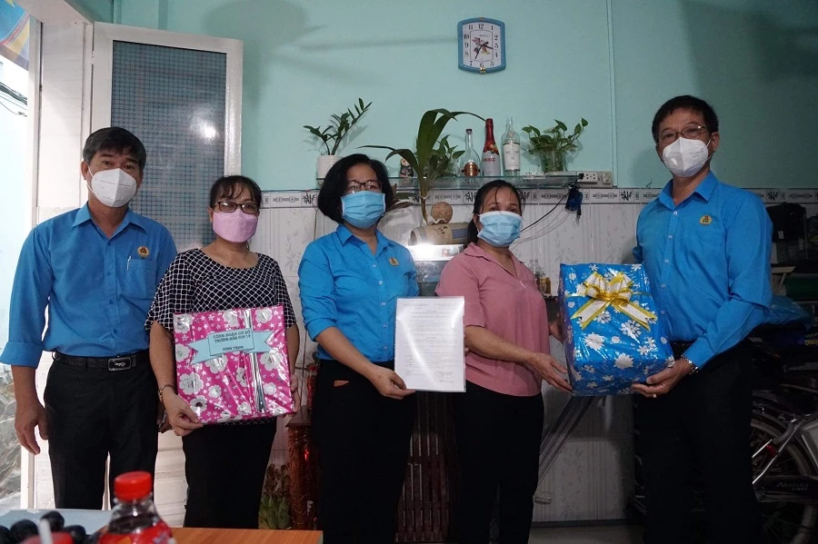 Đại diện Liên đoàn lao động TP.HCM, Liên đoàn lao động quận Bình Thạnh tặng quà cho hai công đoàn viên trong lễ trao "Mái ấm Công đoàn". Ảnh: NH