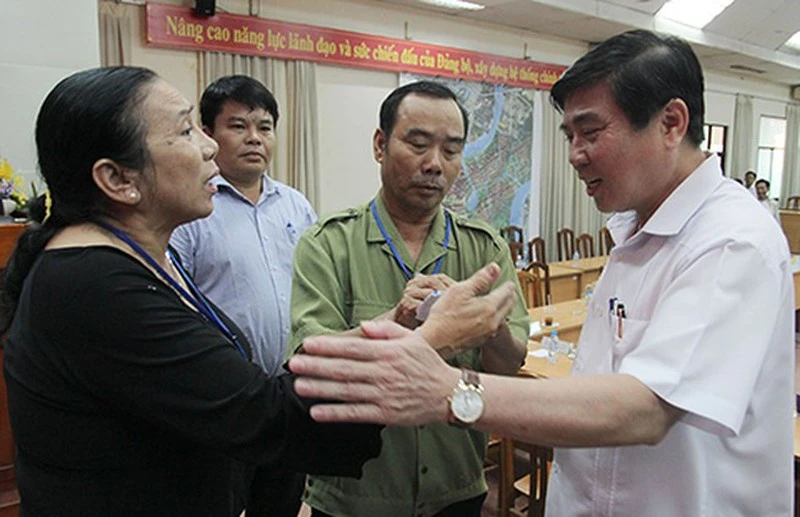 Chủ tịch UBND TP.HCM Nguyễn Thành Phong (ngoài cùng bên trái) trong một lần đối thoại với người dân Thủ Thiêm. Ảnh: HOÀNG GIANG