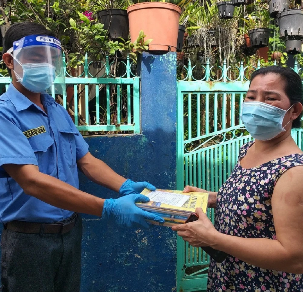 Người dân quận 8 đươc các lực lượng giao sách giáo khoa tận nhà. Ảnh: VD