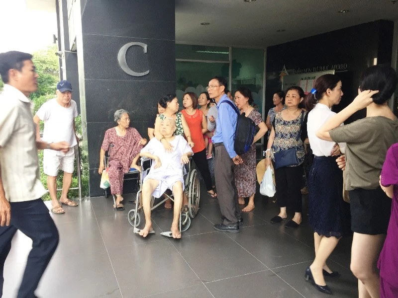 Bà Dung (62 tuổi) sống tại tầng 6 cho biết mình gặp một phen hốt hoảng vì gặp khó khăn khi đưa mẹ già (82 tuổi) xuống đất. "Tôi đẩy cụ trên xe lăn trong sợ hãi vì đám cháy ngay cạnh nhà. May có thang máy dự phòng chứ không biết làm sao đưa cụ xuống" - bà Dung nói.