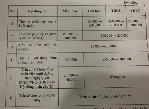 Ngay từ đầu năm học, các đơn vị phải thỏa thuận, thống nhất chủ trương với phụ huynh học sinh để có cơ sở lựa chọn và quyết định các hình thức tổ chức các hoạt động giáo dục. Khung thu quy định cụ thể như sau: