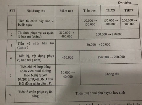 Từ khung mức thu nói trên, Sở yêu cầu các trường tùy vào điều kiện cơ sở vật chất, nhu cầu của phụ huynh để xây dựng dự toán và tính toán mức thu cụ thể. Tuy nhiên, các khoản thu này phải được thống nhất với phụ huynh trước khi thực hiện và khi thu phải cấp hóa đơn cho từng học sinh, thực hiện đầy đủ các chế độ quản lý tài chính.