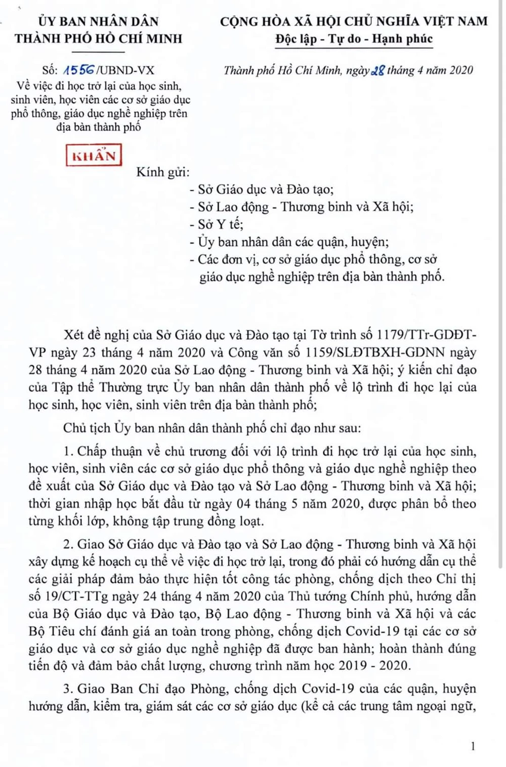 Giao Sở GD&ĐT và Sở LĐ-TB&XH xây dựng kế hoạch cụ thể về việc đi học trở lại, trong đó phải có hướng dẫn cụ thể các giải pháp đảm bảo thực hiện tốt công tác phòng, chống dịch theo Chỉ thị số 19 của Thủ tướng Chính phủ, hướng dẫn của Bộ GD&ĐT, Bộ LĐ-TB&XH và các Bộ tiêu chí đánh giá an toàn trong phòng, chống dịch COVID-19; hoàn thành đúng tiến độ và đảm bảo chất lượng, chương trình năm học 2019-2020.