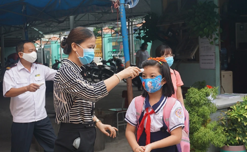 Học sinh lớp 5 Trường Tiểu học An Hội, quận Gò Vấp được đo thân nhiệt trước khi vào trường. Ảnh: NQ