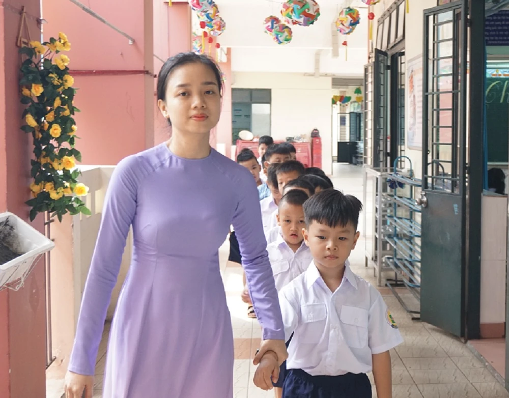 Cô trò trường Tiểu học Lương Thế Vinh, quận Gò Vấp trong ngày tựu trường năm học. Ảnh: NGUYỄN QUYÊN