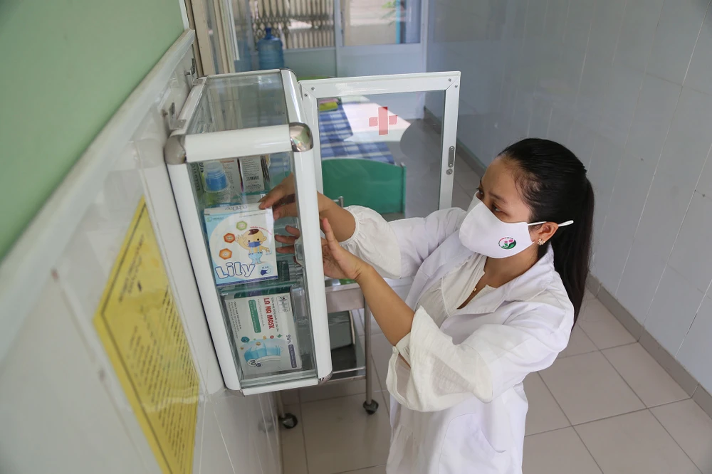 Nhân viên y tế của trường đang sửa soạn lại tủ thuốc trong phòng cách ly y tế dự phòng khi có trường hợp nghi ngờ dương tính với COVID-19.