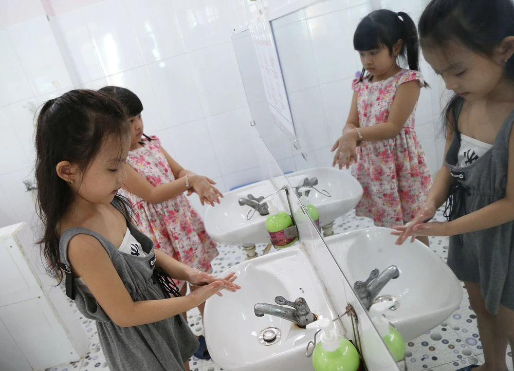 Bà Nguyễn Thị Hoàng Mai - Hiệu trưởng Trường mầm non Hạnh Thông Tây (quận Gò Vấp, TP.HCM) cho biết, trong sáng nay, chỉ khối mẫu giáo từ 3-6 tuổi đến trường, riêng khối nhà trẻ thì theo tình hình qua 1-3 mới mở trở lại. Đồng thời, trước khi đến lớp, nhà trường đã gửi mẫu khai báo cho phụ huynh khai báo y tế cho các em và gửi lên group zalo từng lớp trước khi các em đến lớp. Trước đó nhà trường cũng đã thực hiện diễn tập xử lý tình huống khi trường học có ca F0 để đảm bảo quá trình hoạt động diễn ra một cách tốt nhất. Trong ảnh: Học sinh lớp lá được hướng dẫn rửa tay sát khuẩn trong giờ học.