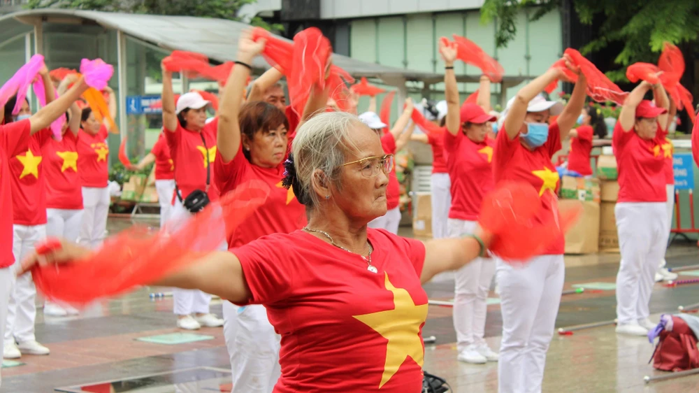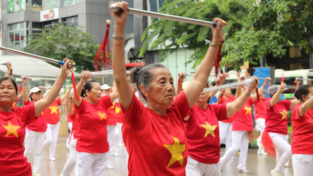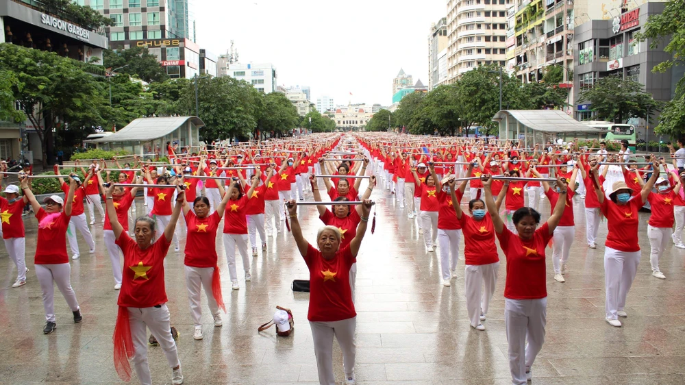 Hơn 2.000 người cao tuổi tham gia đồng diễn thể dục dưỡng sinh, tạo nên một hình ảnh vô cùng đẹp trên đường Nguyễn Huệ, Quận 1, TP.HCM.