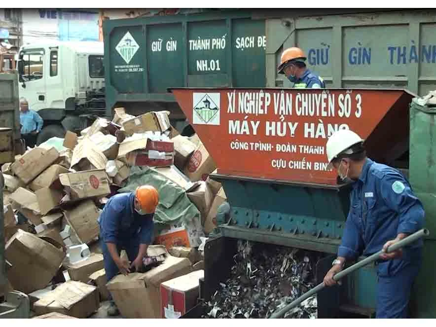 Công nhân đang tiến hành tiêu hủy hàng hóa nhập lậu, hàng giả.