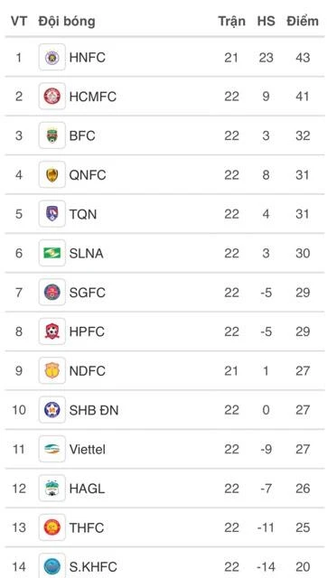 Cuộc chơi đã gần tàn và ngày càng lộ diện rõ hơn đội bóng sẽ phải xuống hạng nhất mùa sau. Ứng cử viên nặng ký nhất cho suất… rớt hạng trực tiếp chính là Sanna Khánh Hòa khi chỉ mới có 20 điểm. Trong khi đó, HA Gia Lai vừa ngược dòng thắng SHB Đà Nẵng 2-1 đã nắm trong tay 26 điểm và đẩy Thanh Hóa rơi xuống áp chót bảng xếp hạng.
