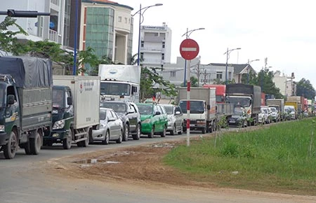Từ 6 giờ hôm qua (30-8), tuyến đường Đồng Văn Cống (quận 2, TP.HCM) bị tắc nghẽn nghiêm trọng, dòng xe dồn ứ kéo dài từ vòng xoay Mỹ Thủy đến cầu Giồng Ông Tố. Nguyên nhân là lượng xe khách đổ dồn về tuyến này quá lớn để đi vào đường cao tốc TP.HCM - Long Thành. Trong khi đó, trên các tuyến quốc lộ 1 về miền Tây, xa lộ Hà Nội và quốc lộ 13 thì lượng xe ít hơn ngày thường.