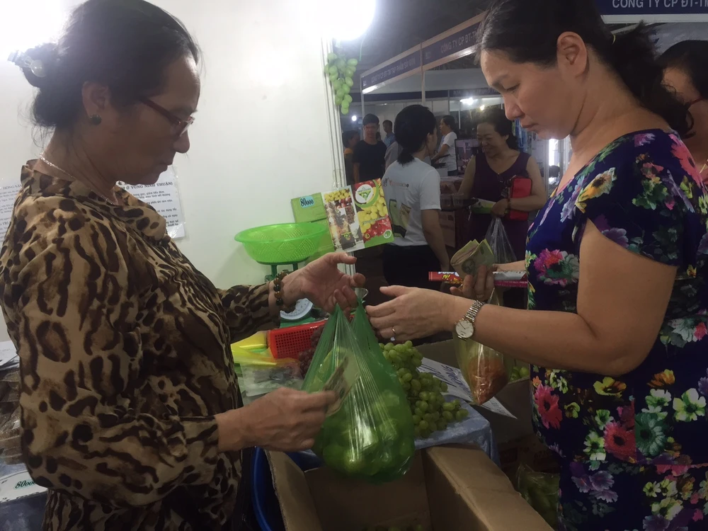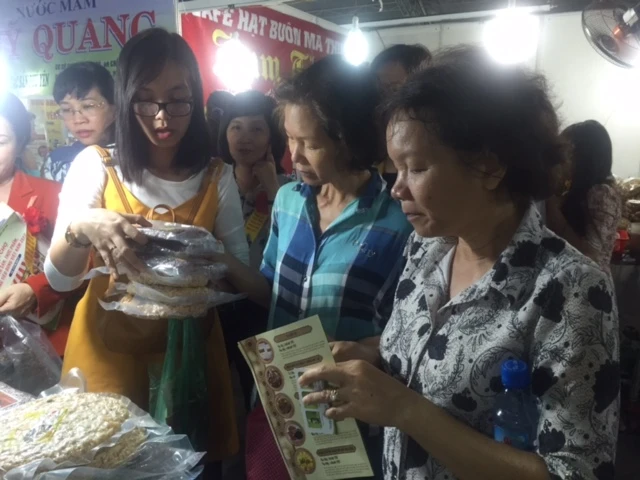 Đêm khai mạc hội chợ các gian hàng nông sản sạch, thực phẩm thu hút nhiều khách tham quan mua sắm. Các gian hàng như thời trang, hóa mỹ phẩm...đều giảm giá mạnh như dép nam 50.000 đồng/đôi, áo đầm trẻ em 90.000 đồng/ba cái...