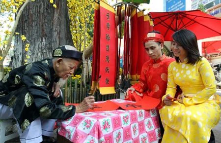Đây là lần thứ sáu phố ông đồ được tổ chức tại Cung văn hóa Lao động TP.HCM, diễn ra từ ngày 19 đến 28-1. Được khai mạc vào ngày cuối tuần nên ngay trong buổi sáng, phố ông đồ đã thu hút đông đảo người dân đến tham quan, xin chữ.