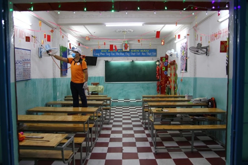 Trường THCS-THPT Đào Duy Anh, quận 6 tổ chức phun thuốc sát khuẩn phòng học. Ảnh: TRẦN MINH