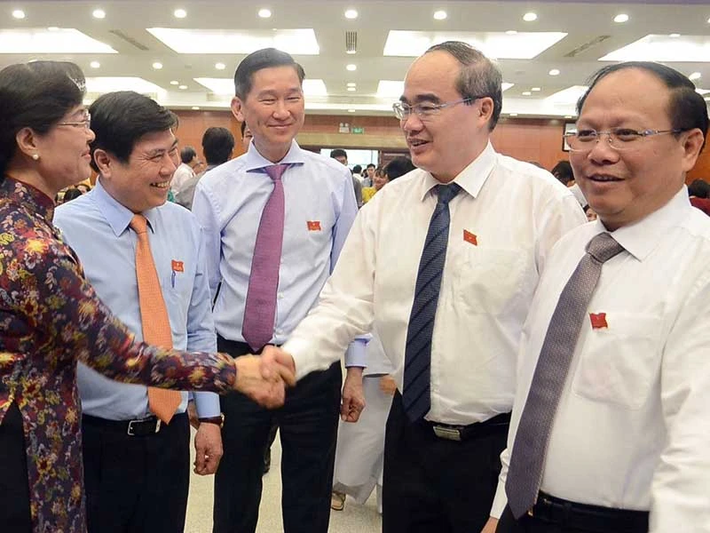 TP.HCM quyết tâm hiện thực hóa cơ chế đặc thù, tạo sức phát triển vượt bậc cho TP. Trong ảnh (từ phải qua): Phó Bí thư Thường trực Thành ủy Tất Thành Cang, Bí thư Thành ủy Nguyễn Thiện Nhân, Phó Chủ tịch UBND TP Trần Vĩnh Tuyến, Chủ tịch UBND TP Nguyễn Thành Phong và Chủ tịch HĐND TP Nguyễn Thị Quyết Tâm. Ảnh: LONG HỒ