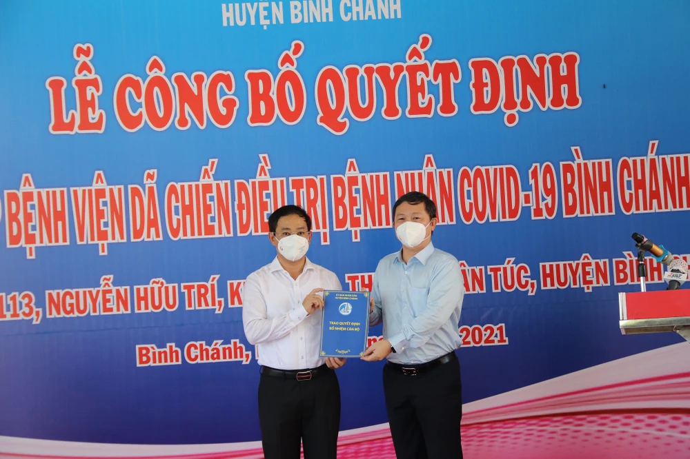 Phó Chủ tịch UBND TP.HCM Dương Anh Đức trao quyết định bổ nhiệm cán bộ cho Bệnh viện dã chiến điều trị COVID-19 số 1 Bình Chánh. Ảnh: HL