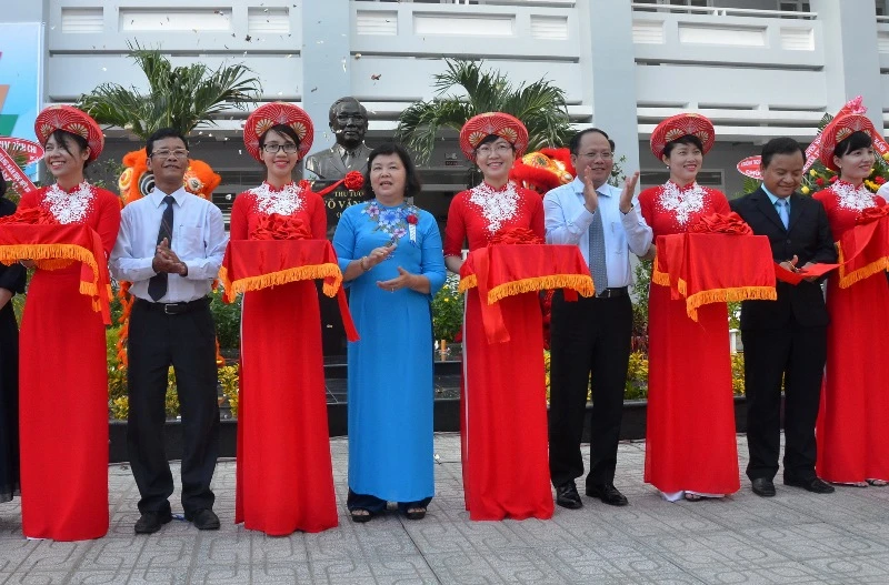 Đại diện lãnh đạo TP và các ban, ngành cắt băng khánh thánh trường và tượng đài Thủ tướng Võ Văn Kiệt
