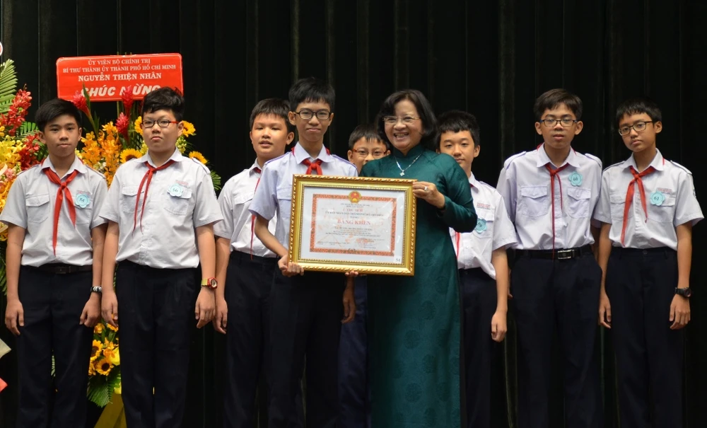 Đại diện lãnh đạo TP.HCM trao bằng khen cho các em đạt giải kỳ thi toán học thế giới vừa qua.