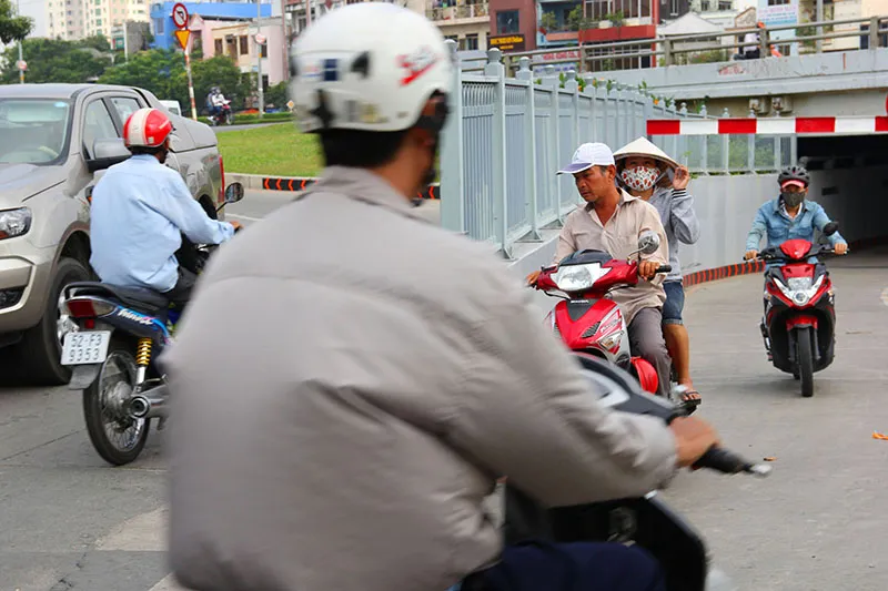 Nhiều người chọn nón lá thay mũ bảo hiểm để chạy qua hầm có biển báo cấm. Ảnh: HOÀNG GIANG