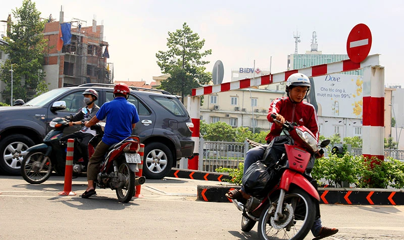 Nhiều người tiết kiệm đến mức đâm ngang dải phân cách để xuống hầm, số ít chọn cách quay đầu đi đường vòng. Ảnh: HOÀNG GIANG