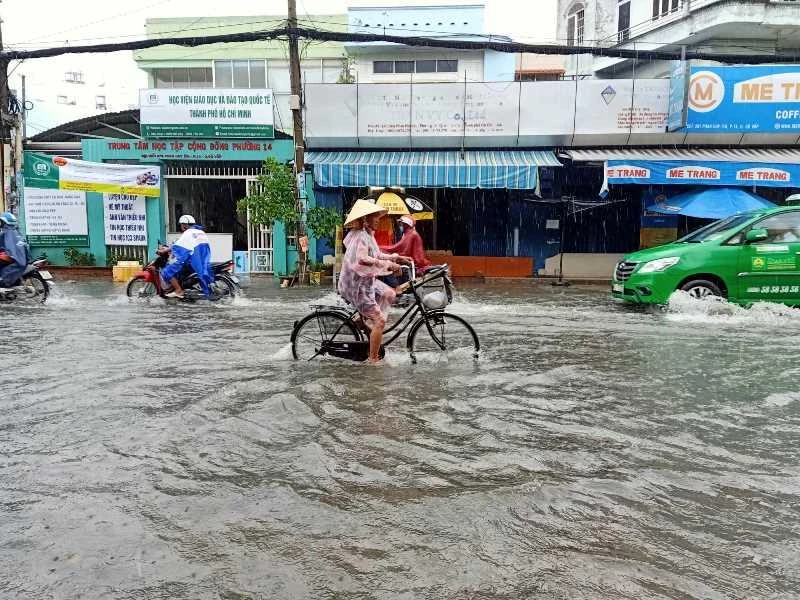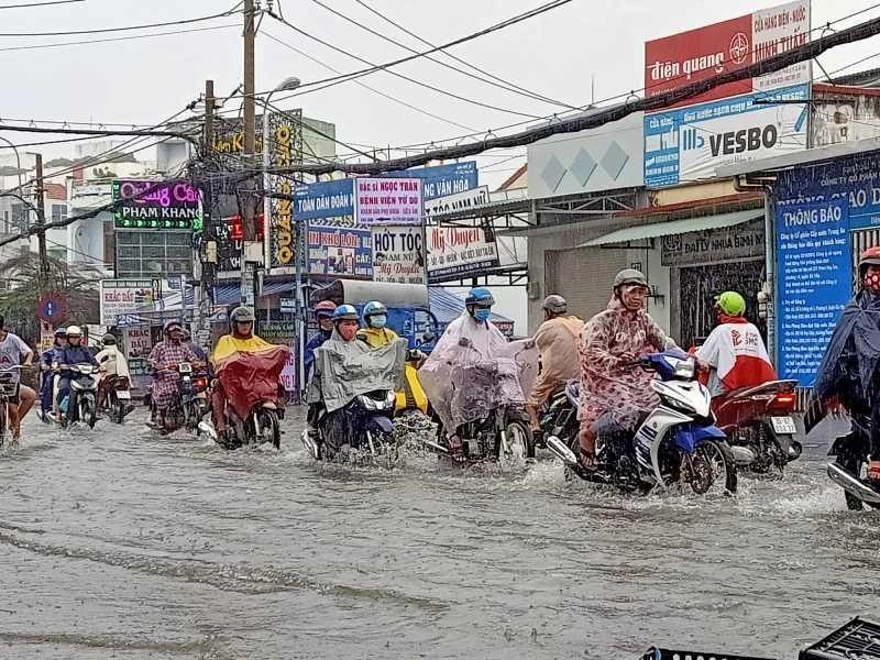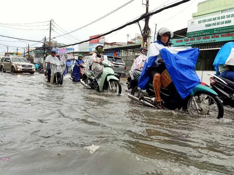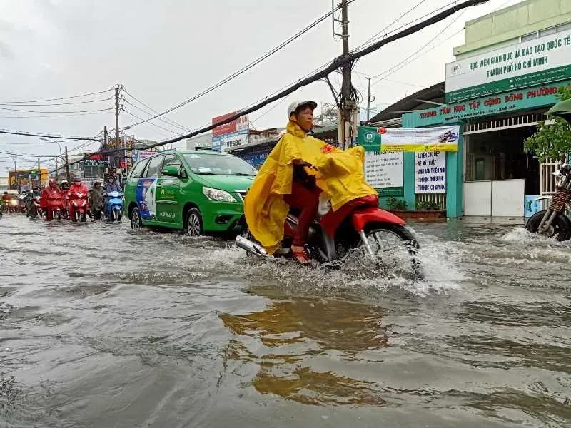 Cơn mưa khá lớn diễn ra trên diện rộng, một số tuyến đường ở quận 1, 3, 4, 5, 8, Bình Thạnh, Gò Vấp… ngập nước. Riêng đường Phan Huy Ích nước dâng cao khoảng nửa bánh xe. Mưa lớn kèm gió lốc khiến các phương tiện di chuyển chậm.