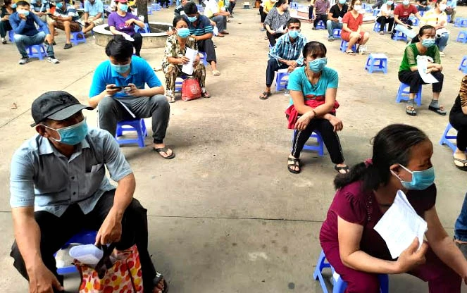 Những người đến tiêm được hướng dẫn và sắp xếp khoảng cách an toàn. Ảnh: TRẦN NGỌC