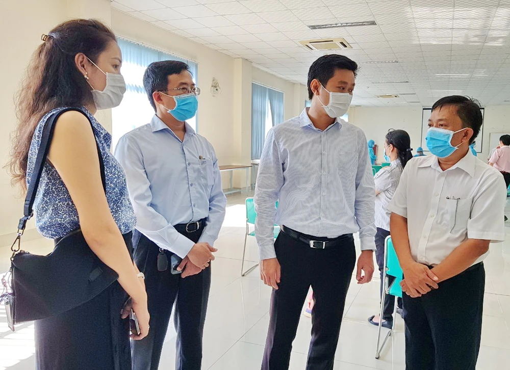 Ông Hứa Quốc Hưng, Trưởng Ban Quản lý các Khu chế xuất và công nghiệp TP.HCM (thứ 2 từ phải sang) giám sát công tác xét nghiệm sàng lọc COVID-19 ở Khu chế xuất Tân Thuận, sáng13-5. Ảnh: PV