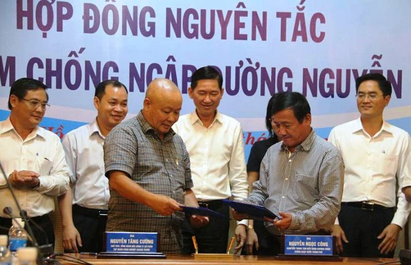 Trung tâm chống ngập TP.HCM (đại diện UBND TP) và Tập đoàn Công nghiệp Quang Trung ký kết hợp đồng nguyên tắc chống ngập cho đường Nguyễn Hữu Cảnh. Ảnh: TÁ LÂM